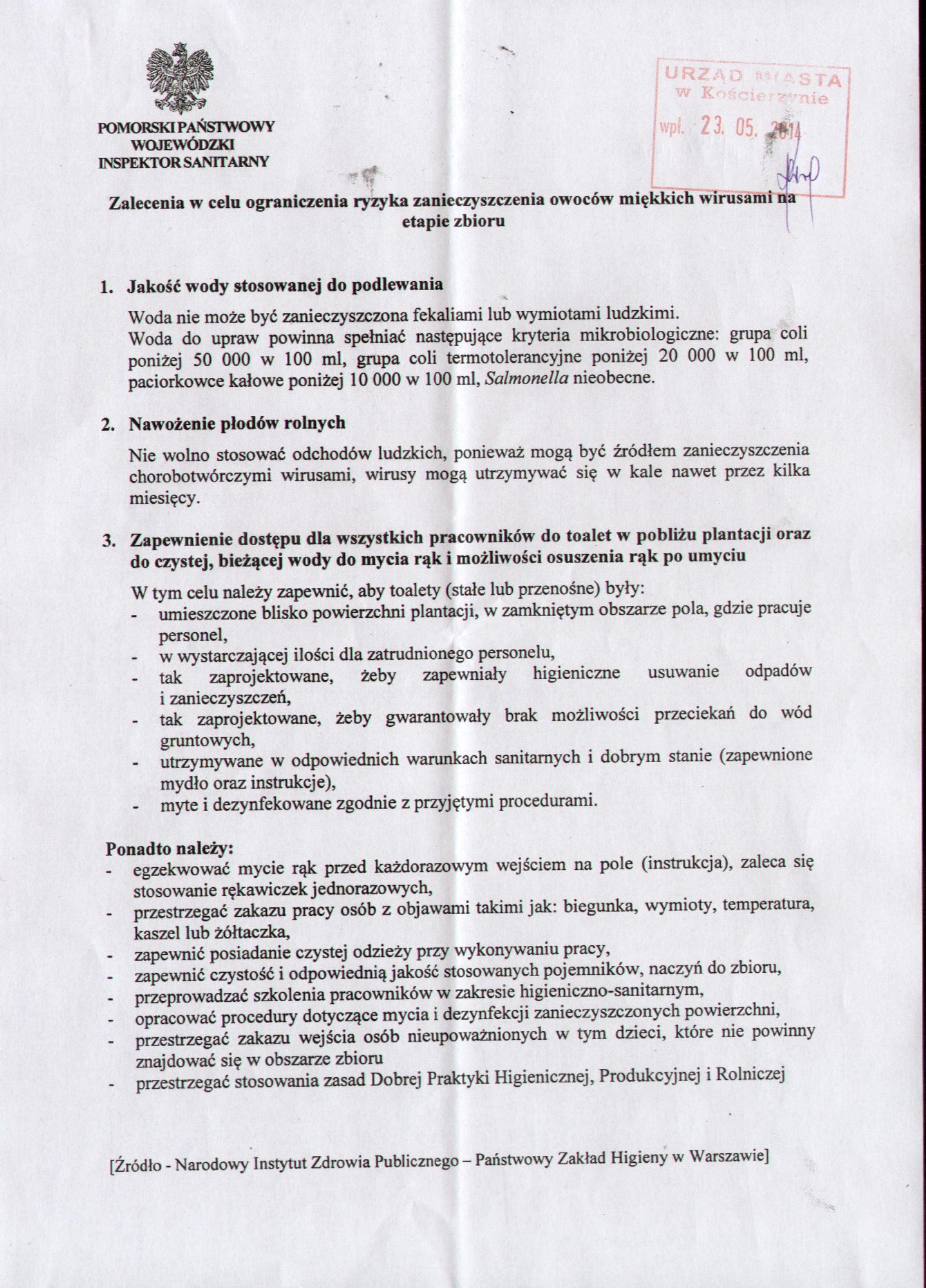 Zalecenia Pomorskiego Państwowego Wojewódzkiego Inspektoratu Sanitarnego dla plantatora owoców na temat wymagań higieniczno-sanitarnych jakie powinien spełnić podczas zbioru owoców miękkich w celu ochrony przed zanieczyszczeniami mikrobiologicznymi.