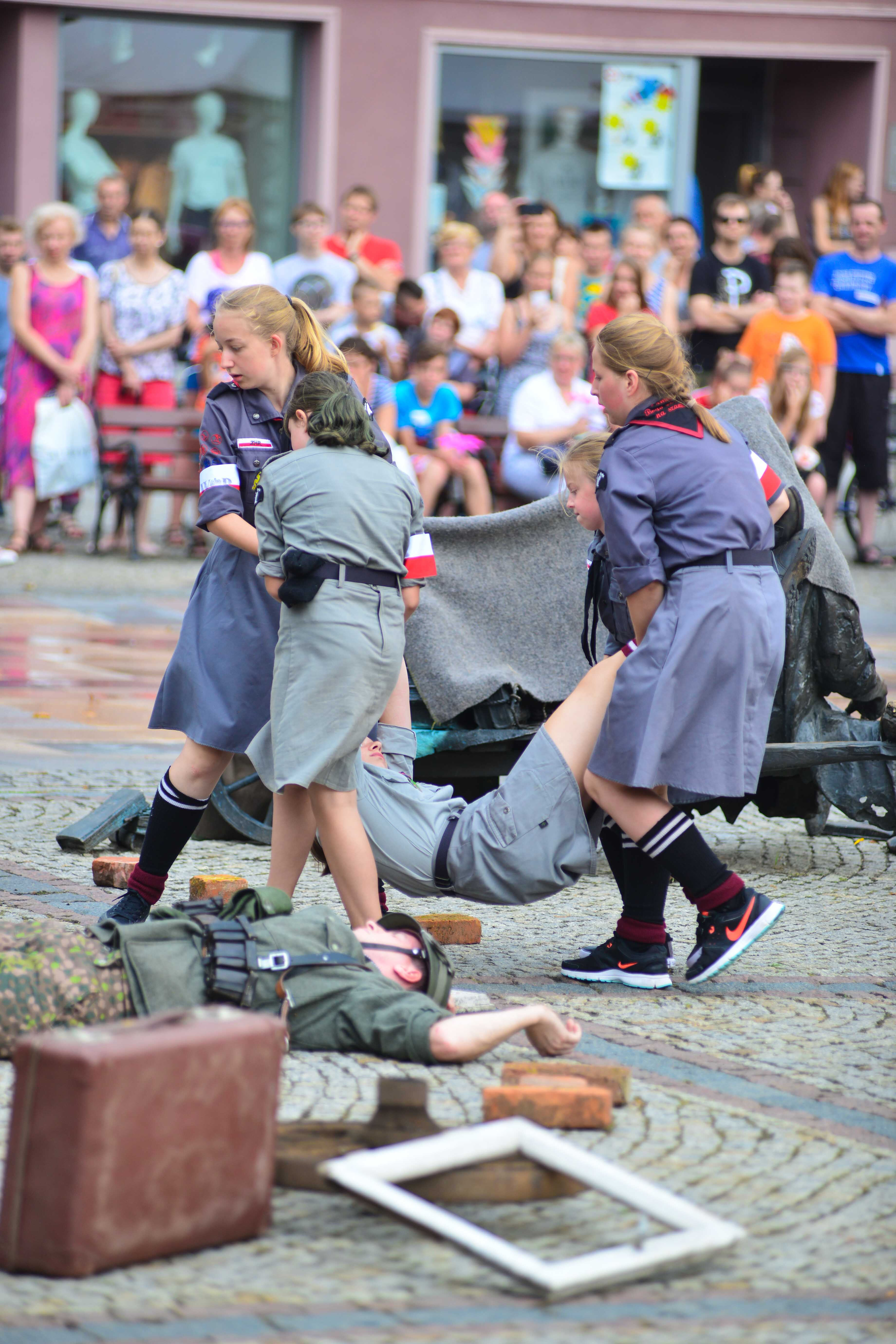 Cała inscenizacja rozpoczęła się o godz. 17.00, w godzinę „W" gdy zawyły syreny, a zgromadzeni na kościerskim rynku mieszkańcy minutą ciszy uczcili pamięć poległych powstańców warszawskich. Następnie przy wystrzałach z karabinów i huku z dział rozpoczęły się walki uliczne, podczas których harcerze odgrywający powstańców zdobywali posterunek niemiecki, na którym zawiesili biało - czerwoną flagę.
