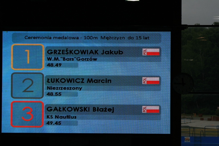 Zawody zaczęły się więc dla naszego zawodnika wyśmienicie. Po przerwie obiadowej Marcin wystartował w konkurencji 400PP i ponownie stanął na podium na najniższym stopniu. Osiągnięcie to jest tym bardziej znaczące, że wcześniej Marcin płynął już 2 długie dystanse(200BF i 800PP). Ostatni start pierwszego dnia zawodów w konkurencji 50 BF przyniósł pechowe 4 miejsce, ponieważ do medalu zabrakło 0,01s, a do srebra 0,05s.