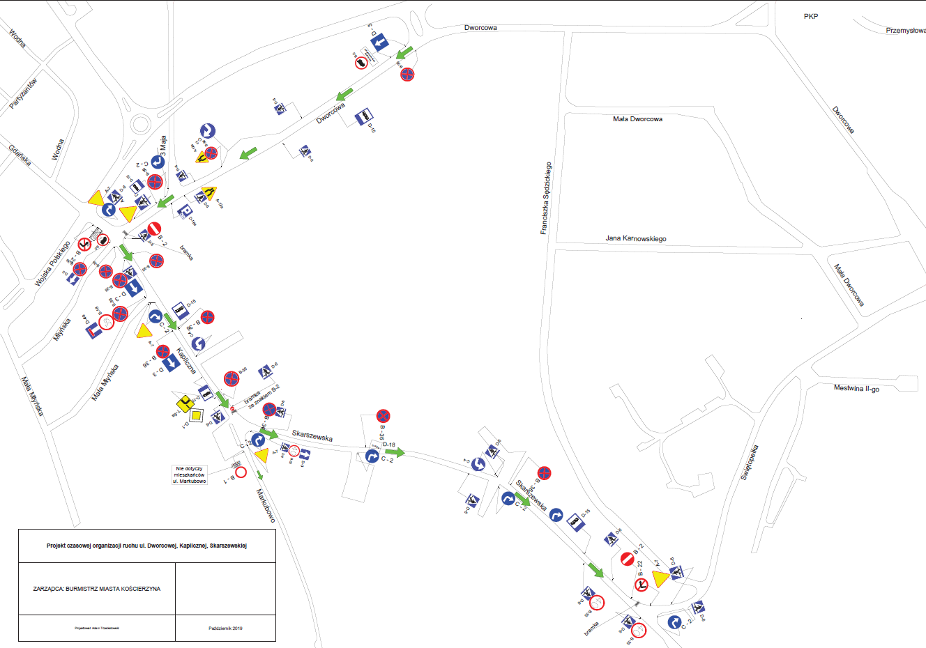 W okresie od 30 października 2019 r. (od godz. 7:00) do 4 listopada 2019 r. (do godz. 7:00) na ulicy Dworcowej (dotyczy odcinka ulicy od skrzyżowania z ul. Wojska Polskiego do skrzyżowania z ul. Kapliczną), Kaplicznej, Markubowo i Skarszewskiej (dotyczy odcinka ulicy od skrzyżowania z ul. Kapliczną do skrzyżowania z ul. Świętopełka) w Kościerzynie nastąpi czasowa zmiana organizacji ruchu, która polegać będzie na wprowadzeniu ruchu jednokierunkowego. Wprowadzona zmiana organizacji ruchu ma na celu ograniczenie ruchu pojazdów w rejonie cmentarza w okresie dnia Wszystkich Świętych i zapewnienie bezpieczeństwa użytkownikom ruchu w tym również pieszym.