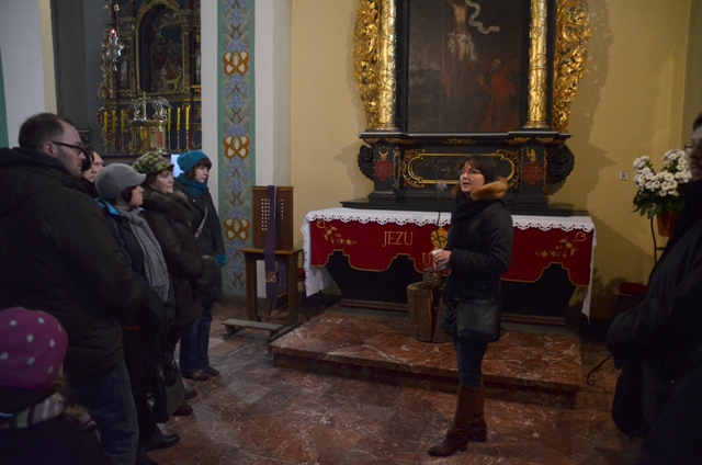 Kościerskimi „śladami Remusa” poprowadziła Beata Jankowska. Mimo zimowej aury uczestników zwiedzania nie zabrakło i na kościerskim rynku o godz. 14.00 pojawiło się ponad 20 osób. Podążanie śladami Remusa rozpoczęło się od Sanktuarium Matki Bożej Kościerskiej Królowej Rodzin w kościele p.w. Świętej Trójcy, w którym Beata Jankowska opowiedziała historię cudownego obrazu Matki Bożej Śnieżnej. Następnie uczestnicy mieli okazję poznać między innymi historię ołtarza głównego, ołtarza ukrzyżowania Jezusa Chrystusa jak i innego wyposażenia świątyni oraz historię kościerskiej parafii i jej duszpasterzy.