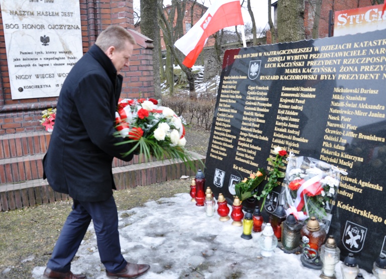 W dniu dzisiejszym przedstawiciele władz miasta złożyli kwiaty i znicze pod tablicą upamiętniającą ofiary katastrofy smoleńskiej.