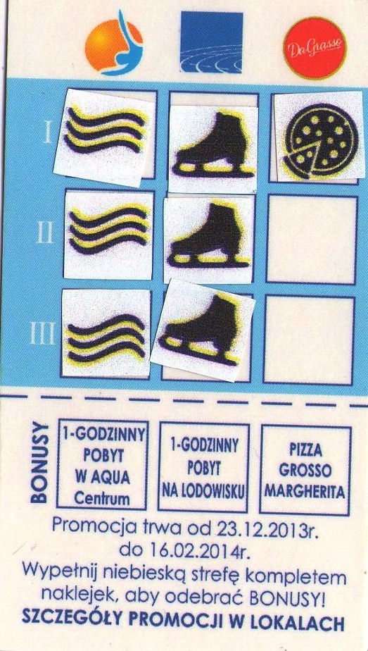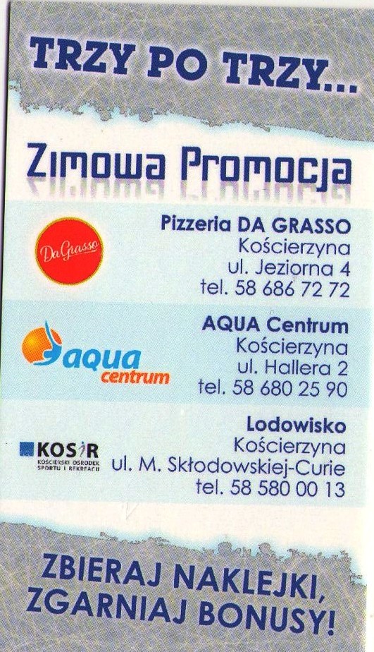Lodowisko miejskie przystąpiło do zimowej promocji „trzy po trzy”, która polega na zbieraniu naklejek i zgarnianiu bonusów. Za każdą wykupioną godzinę na lodowisku otrzymasz naklejkę. Po zebraniu 3 naklejek z lodowisko oraz dodatkowo po trzy z basenu AQUA Centrum oraz Pizzerii Da Grasso w Kościerzynie otrzymacie Państwo darmowy 1-godzinny pobyt na lodowisku oraz w AQUA Centrum oraz darmową pizze Grosso Margherita.
