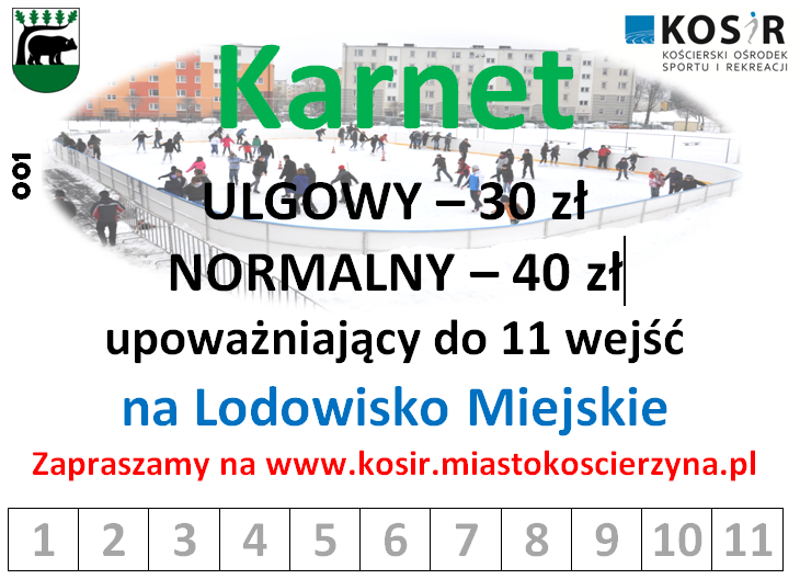 Miło nam również poinformować, że Kościerski Ośrodek Sportu i Rekreacji przystapił do akcji KOŚCIERSKA KARTA DUŻEJ RODZINY.  Od stycznia na lodowisku miejskim rodziny posiadające taką kartę będą mogły korzystać z specjalnych cen: biletu wstępu (2 zł) oraz wypożyczenia 1 pary łyżew (2 zł).