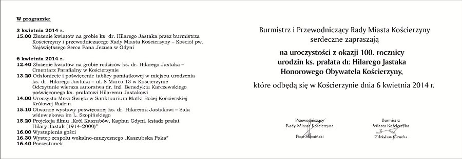 Główne uroczystości w Kościerzynie rozpoczną się 6 kwietnia o godzinie 12.40 złożeniem kwiatów na grobach rodziców ks. Hilarego Jastaka znajdujących się na Cmentarzu Parafialnym w Kościerzynie. O godz. 13.20 odbędzie się odsłonięcie tablicy pamiątkowej w miejscu urodzenia Honorowego Obywatela naszego miasta przy ul. 8 Marca 13. Uroczysta Msza Św. w Kościele pw. Św. Trójcy pod przewodnictwem ks. abp. Henryka Józefa Muszyńskiego, prymasa seniora, rozpocznie się o godz. 14.00. Po Mszy Świętej około godz. 15.10 serdecznie zapraszamy do Sali widowiskowej im. Lubomira Szopińskiego gdzie odbędzie się m.in. otwarcie wystawy obrazującej dzieciństwo i młodość ks. Hilarego w Kościerzynie oraz projekcja filmu poświęconego ks. prałatowi. Serdecznie zapraszamy do uczestnictwa w uroczystościach.