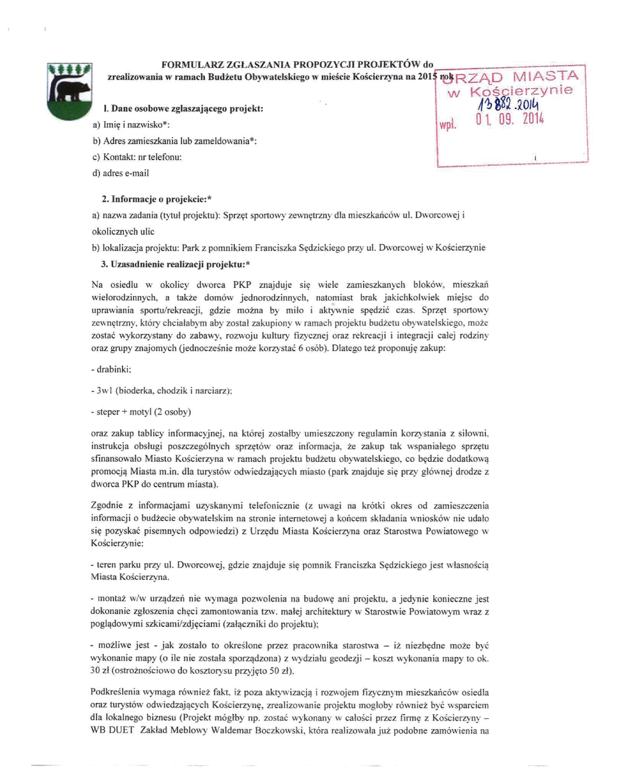 Sprzęt sportowy zewnętrzny dla mieszkańców ul. Dworcowej i okolicznych ulic - WNIOSEK str. 1, WNIOSEK str. 2 |