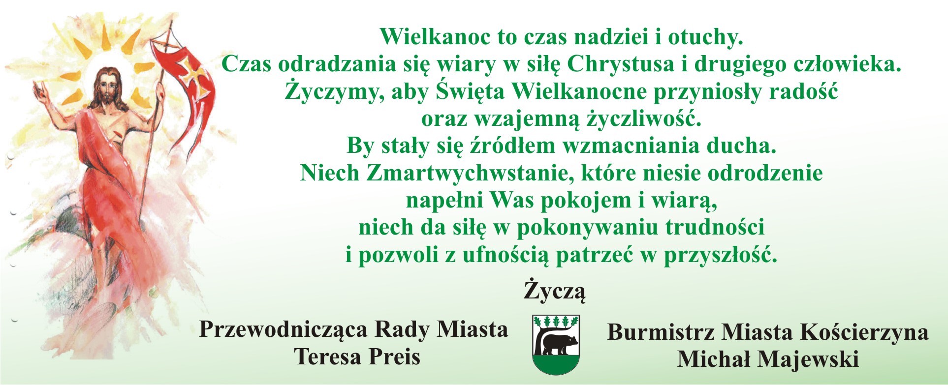 Wielkanoc to czas nadziei i otuchy. Czas odradzania się wiary w siłę Chrystusa i drugiego człowieka. Życzymy, aby Święta Wielkanocne przyniosły radość oraz wzajemną życzliwość. By stały się źródłem wzmacniania ducha. Niech Zmartwychwstanie, które niesie odrodzenie napełni Was pokojem i wiarą, niech da siłę w pokonywaniu trudności i pozwoli z ufnością patrzeć w przyszłość. Życzą: Przewodnicząca Rady Miasta - Teresa Preis oraz Burmistrz Miasta Kościerzyna - Michał Majewski.