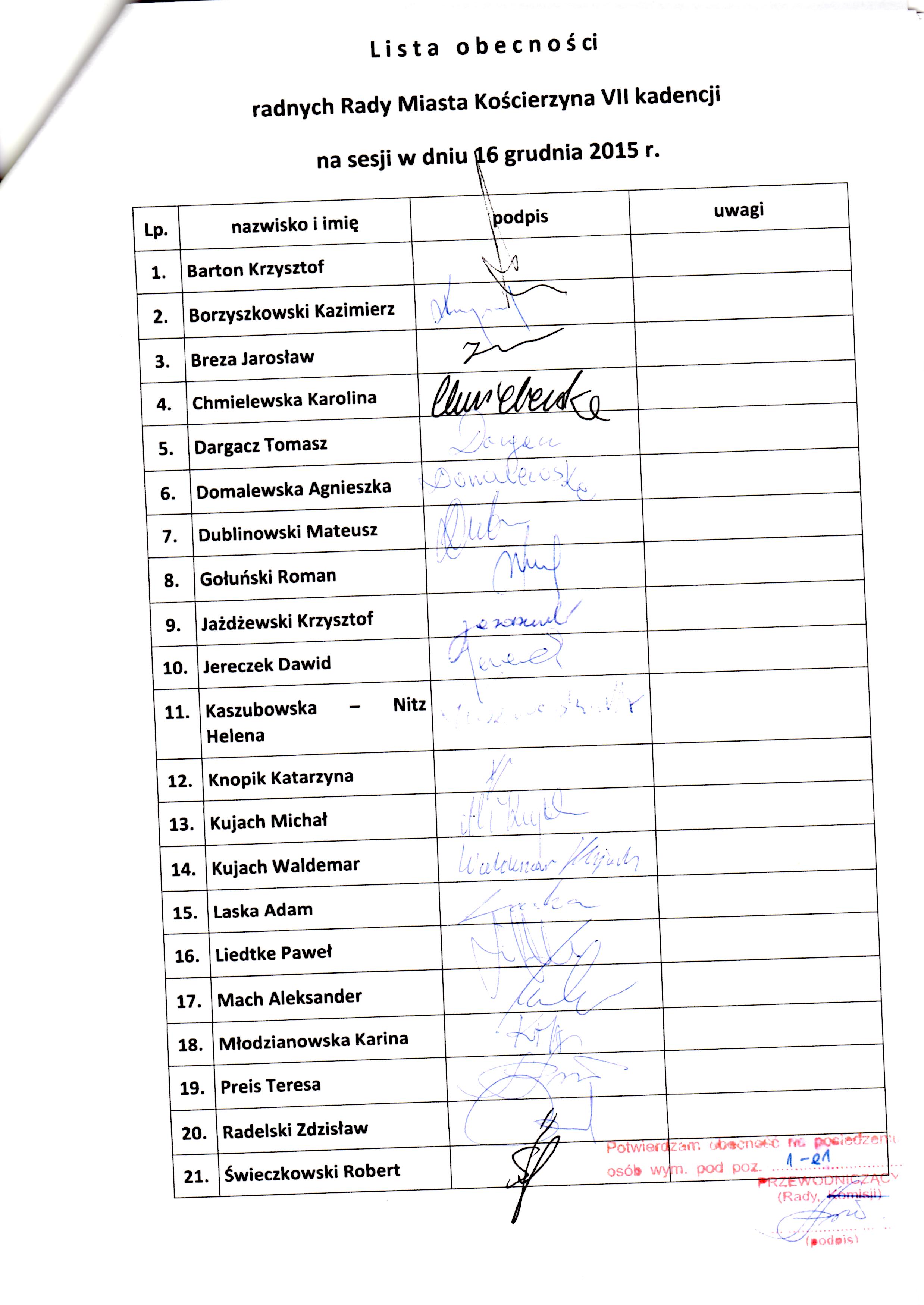 / Rada Miasta / Sesje VII kadencji Rady Miasta Kościerzyna / XXI Sesja Rady Miasta Kościerzyna - 16 grudnia 2015 roku