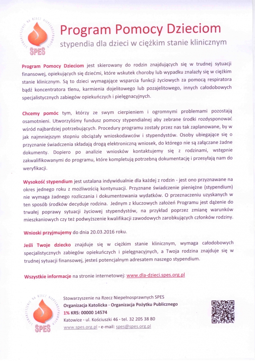 Drodzy Państwo, rodziny znajdujące się w trudnej sytuacji finansowej, opiekujący się dziećmi w ciężkim stanie klinicznym, mogą starać się o roczne stypendium Stowarzyszenia SPES. Nabór wniosków trwa do 20.03.2016r.