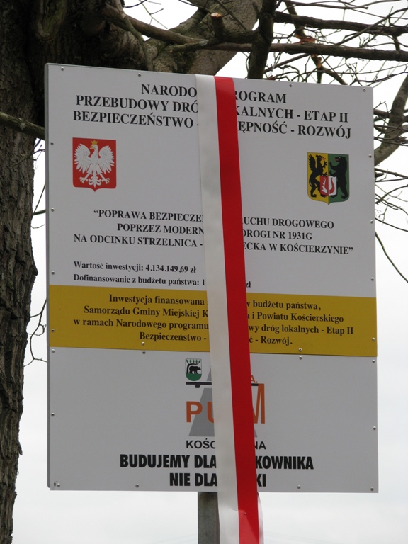 W dniu 24 października br. miało miejsce uroczyste otwarcie drogi, która powstała w ramach inwestycji pn. „Poprawa bezpieczeństwa ruchu drogowego poprzez modernizację drogi nr 1931G na odcinku ul. Strzelnica – Strzelecka w Kościerzynie” zrealizowaną w ramach Narodowego Programu Przebudowy Dróg Lokalnych - Etap II Bezpieczeństwo - Dostępność – Rozwój.