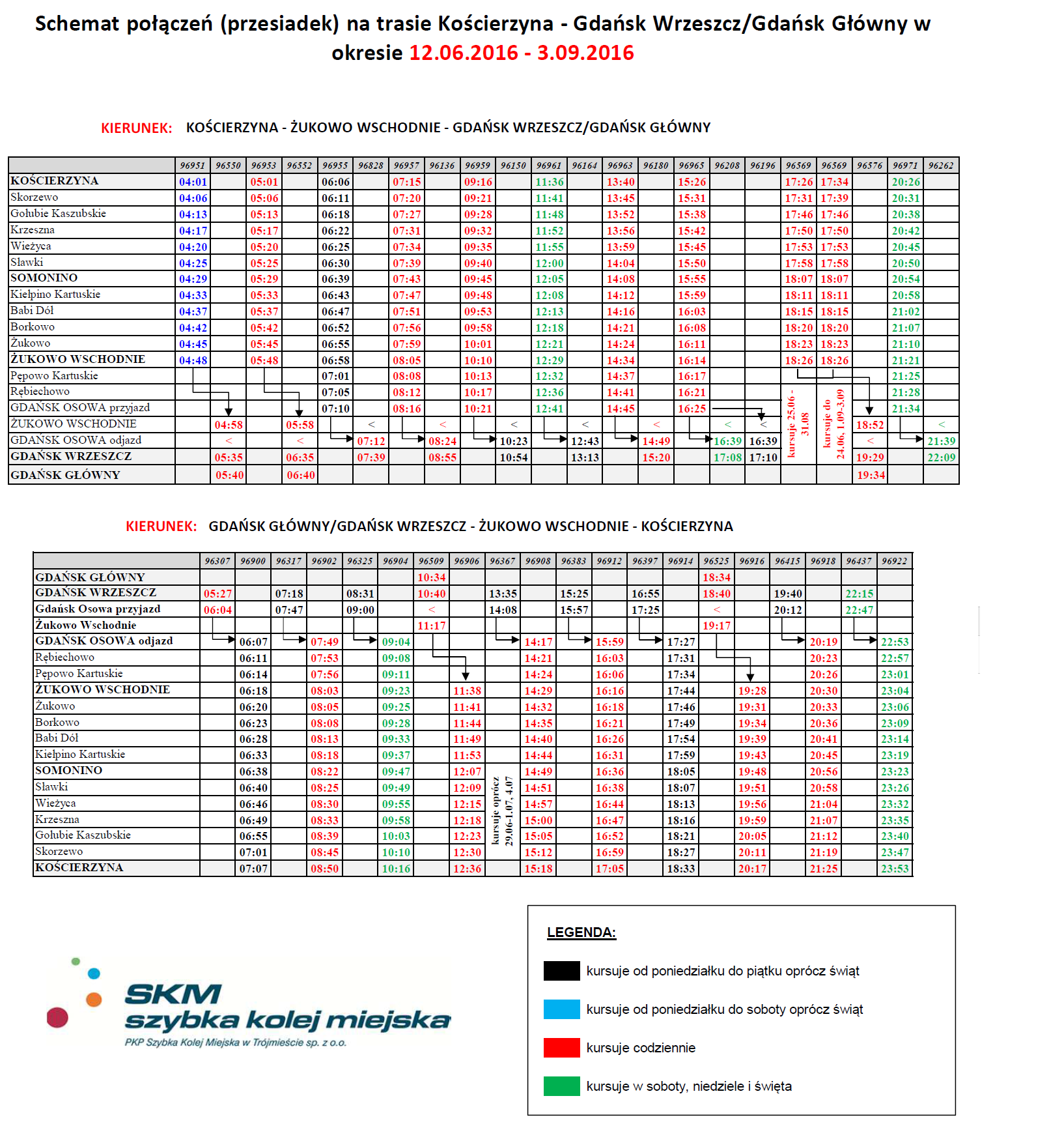 Poniżej prezentujemy Państwu aktualny schemat połączeń (przesiadek) na trasie Kościerzyna – Gdańsk Wrzeszcz/Gdańsk Główny w okresie od 12.06.2016 r. do 03.09.2016 r.