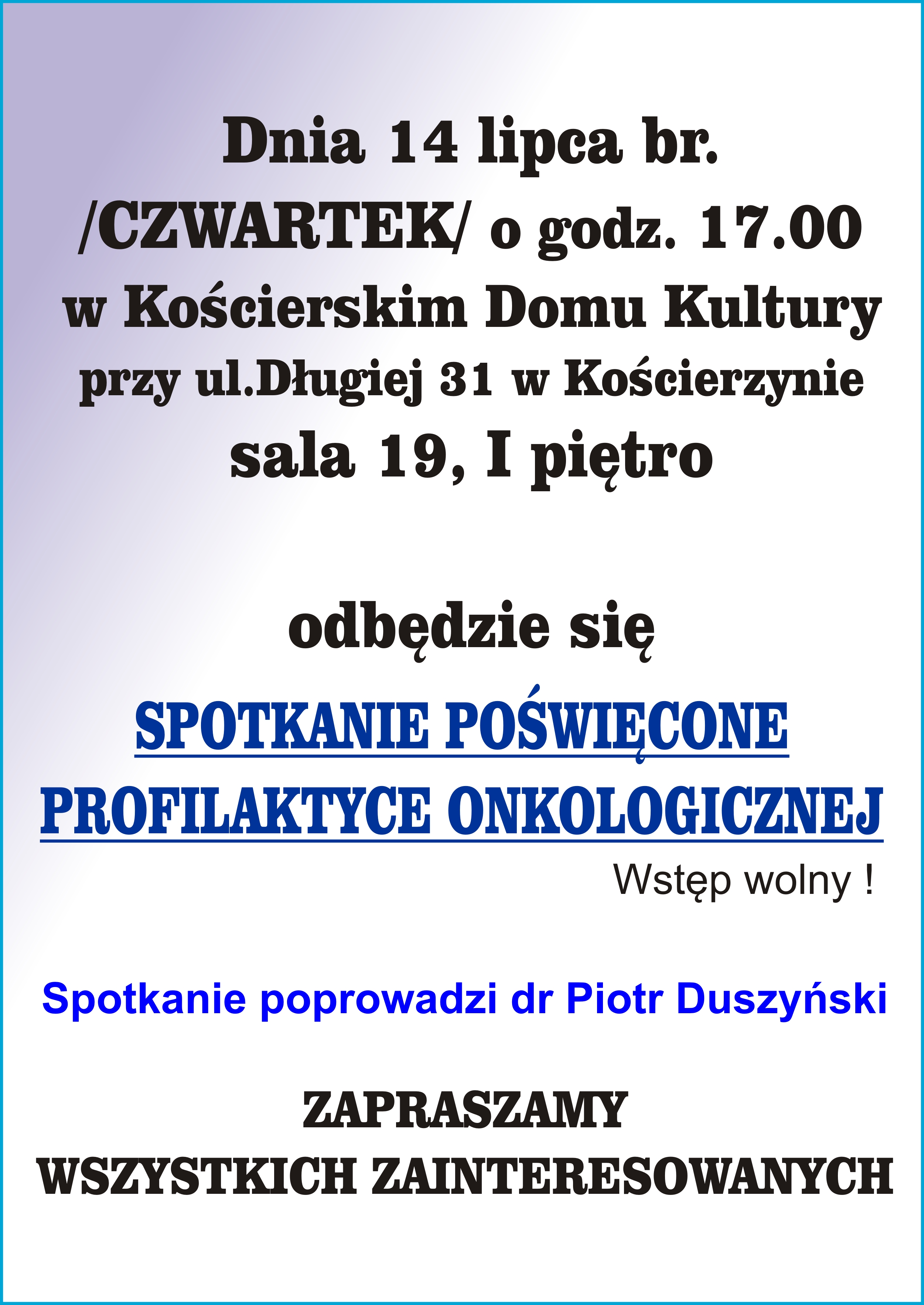 Zapraszamy na spotkanie poświęcone profilaktyce onkologicznej, które odbędzie się 14 lipca 2016 roku o godz. 17.00 w świetlicy seniora w Kościerskim Domu Kultury w Kościerzynie. Szczegółowe informacje znajdą Państwo na plakacie.