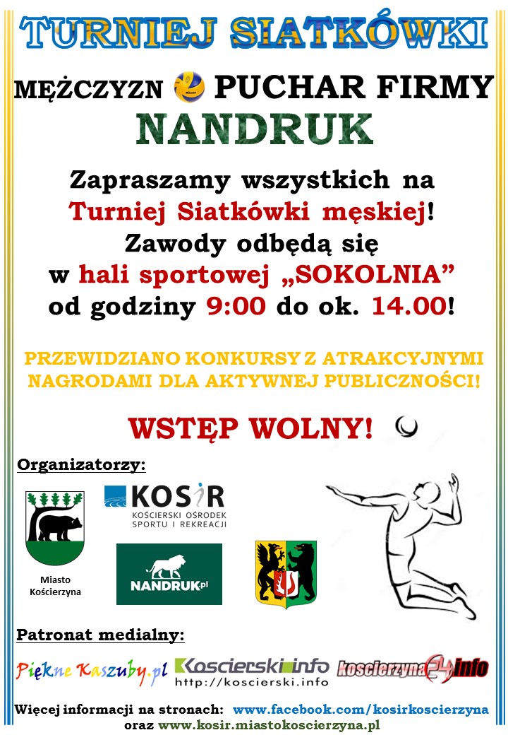Dnia 29 kwietnia 2017 r. odbędzie się Turniej Siatkówki Mężczyzn o Puchar Firmy „NANDRUK”.