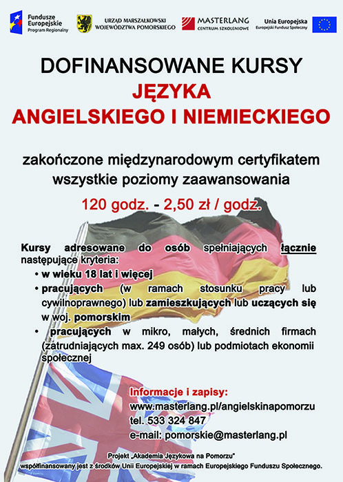 Szanowni Państwo, od 1 czerwca 2017 r. rozpoczęły się kursy w ramach Akademii Językowej na Pomorzu. Dzięki temu projektowi zdobędziesz wysokie umiejętności języka angielskiego i niemieckiego, a tym samym zyskasz w oczach obecnego, bądź przyszłego pracodawcy.