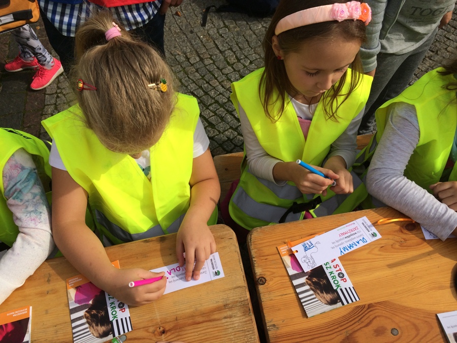 Na rynku dzieci przygotowywały specjalne PRZYPOMINAJKI dla swoich najbliższych, ale również miały przeszkolenie symulacyjne z przechodzenia na pasach. Straż Miejska przygotowała specjalne zadania szkoleniowe dla dzieci, które odbywały się na prawdziwych pasach.  Utrwalone będzie hasło AKCJI KOŁA STOP ROBISZ KROK oraz nawyk upewnienia się, czy wszystkie pojazdy się zatrzymały.