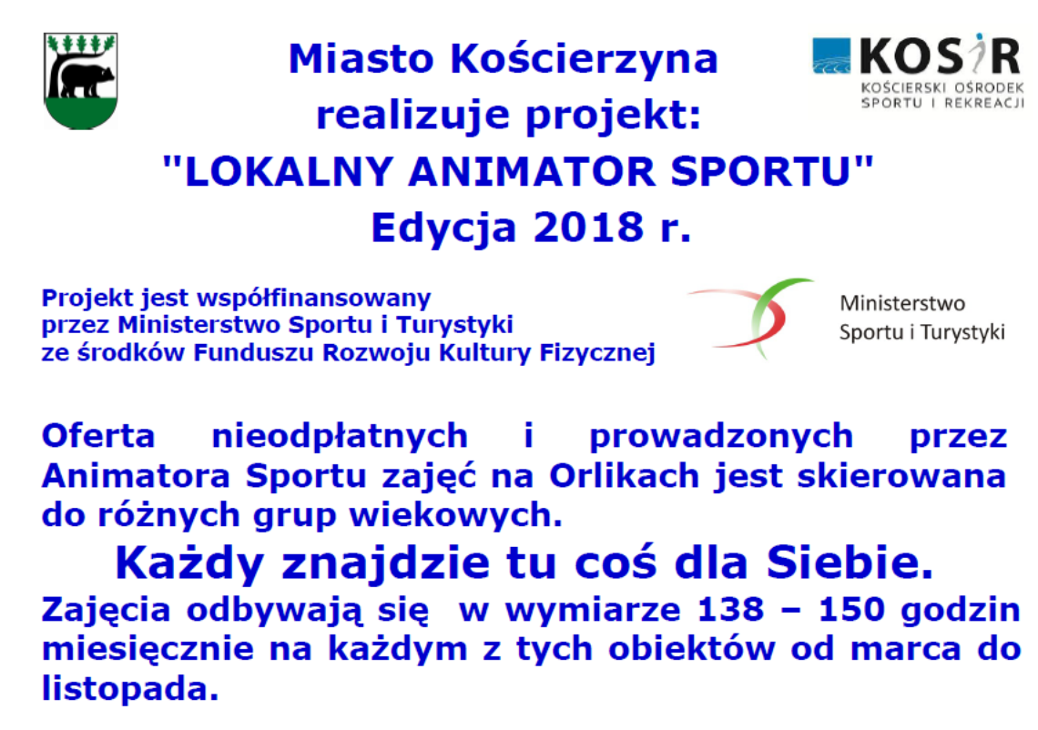 Projekt „Lokalny Animator Sportu” realizowany będzie od 1 marca do 30 listopada 2018 r. Dzięki dofinansowaniu ze środków Ministerstwa Sportu i Turystyki na Orlikach odbywają się zajęcia prowadzone przez wykwalifikowanych Animatorów, instruktorów sportu różnych dyscyplin. Zajęcia są całkowicie bezpłatne. Obiekty wyposażone są w sprzęt sportowy oraz gry plenerowe dla całych rodzin.
