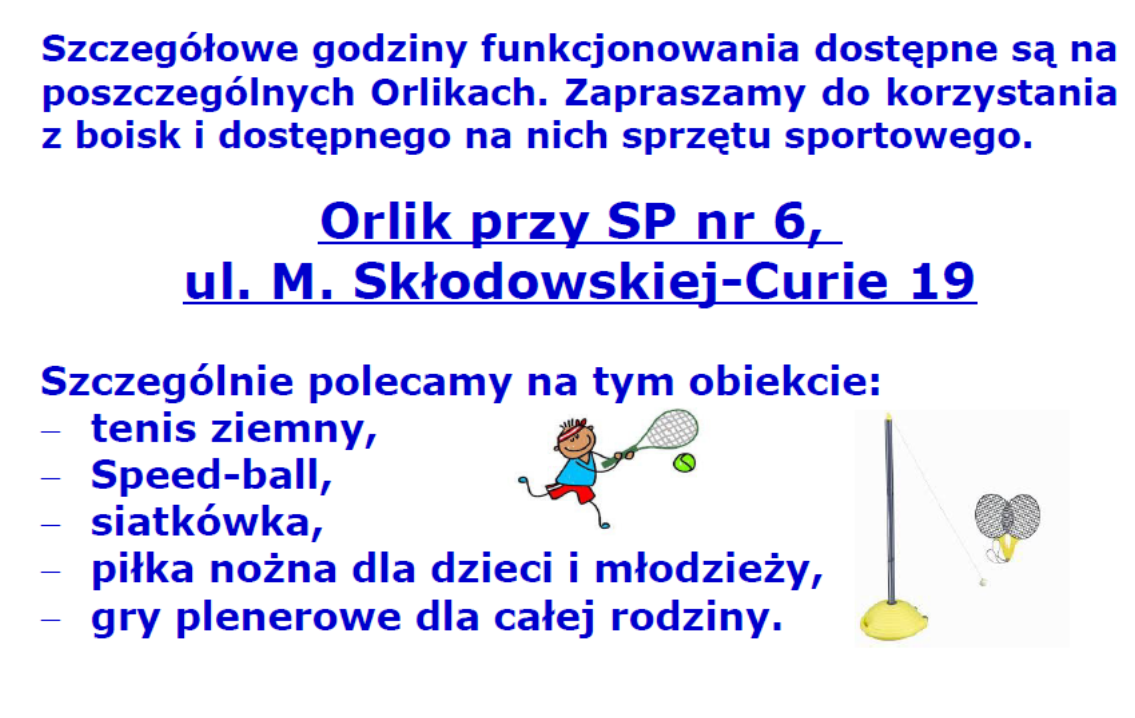 Orliki czynne są popołudniami i w weekendy. Szczegółowe informacje odnośnie zajęć prowadzonych przez Animatorów i godziny funkcjonowania dostępne są na poszczególnych Orlikach.