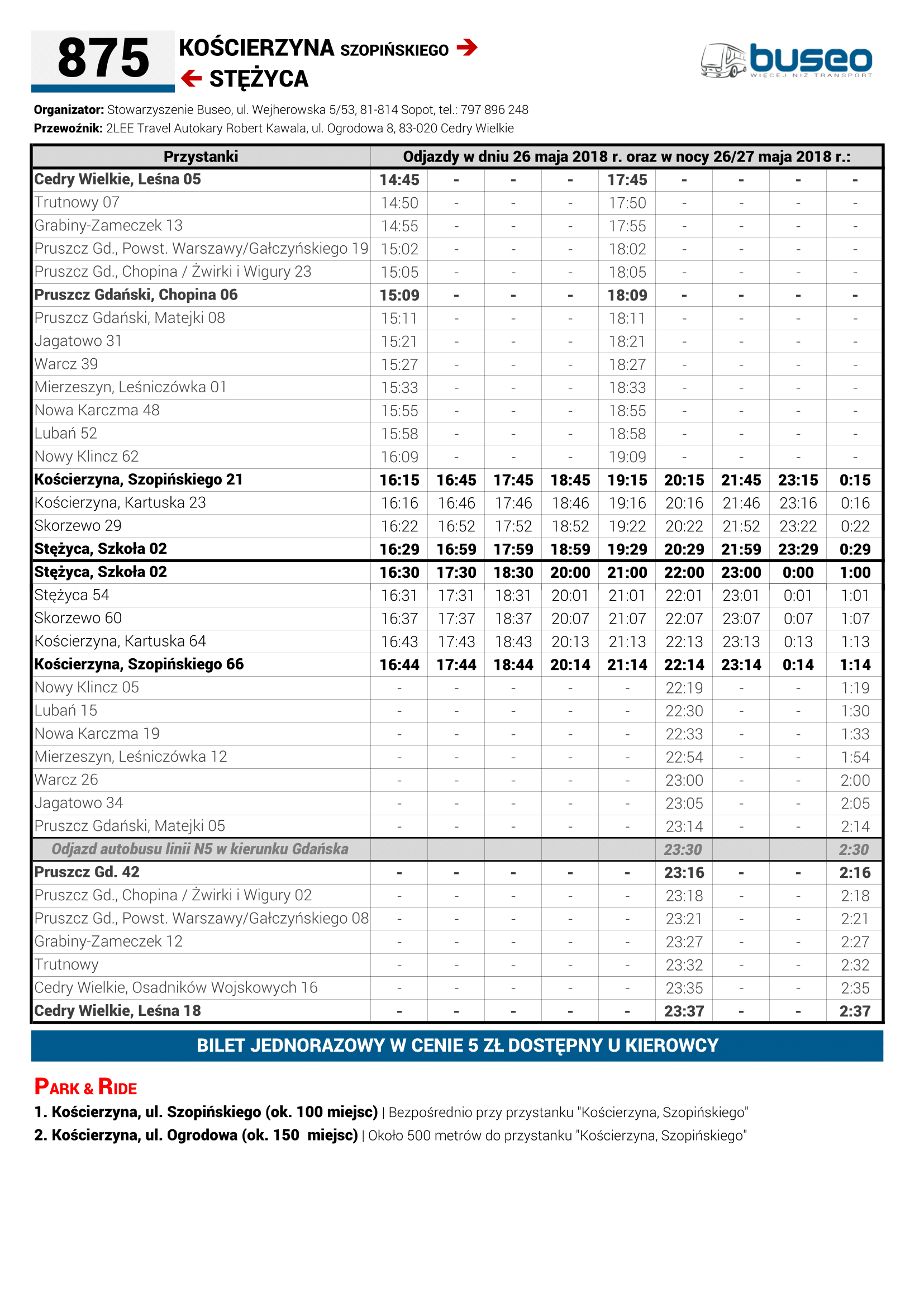 Szanowni Państwo, w związku z imprezą pod nazwą „Przebojowa Majówka w Stężycy” publikujemy rozkład jazdy autobusów na trasie Kościerzyna – Stężyca – Kościerzyna w dniu 26 maja 2018 r.