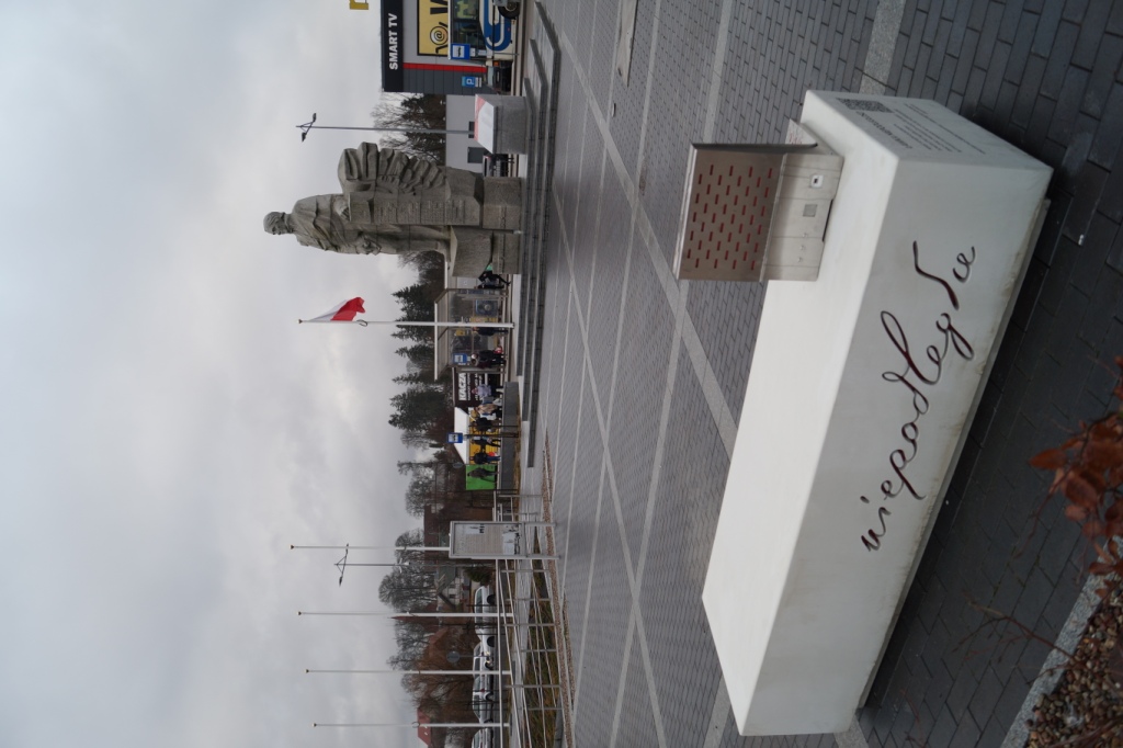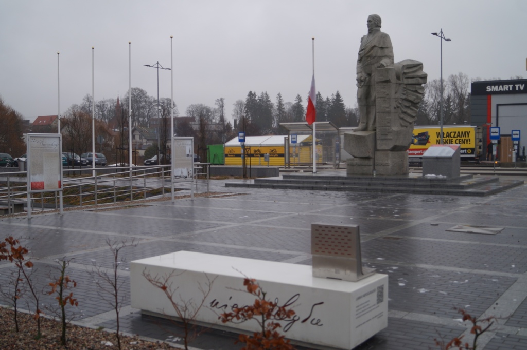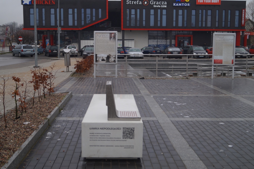 - odnoszącego się do lokalnych tradycji oręża polskiego związanych z odzyskaniem przez Polskę niepodległości. Z głośnika ławki usłyszymy następujące słowa: „ W zimowy, sobotni dzień 31 stycznia 1920r. po 148 latach niewoli, do odświętnie udekorowanej biało-czerwonymi flagami Kościerzyny, pośród wszechobecnej radości i euforii mieszkańców, wkroczyły polskie oddziały Błękitnej Armii generała Józefa Hallera. Wkroczenia nie byłoby jednak bez jesieni 1918r. i poprzedzających ją walk o niepodległość na frontach I wojny światowej oraz odważnych decyzji kościerskiej społeczności, która już w listopadzie 1918 roku usunęła ze stanowiska niemieckiego burmistrza, a jej przedstawiciele: Antoni Abraham i Tomasz Rogala, potwierdzali polskość tych ziem na pokojowej konferencji w Wersalu w 1919r….”