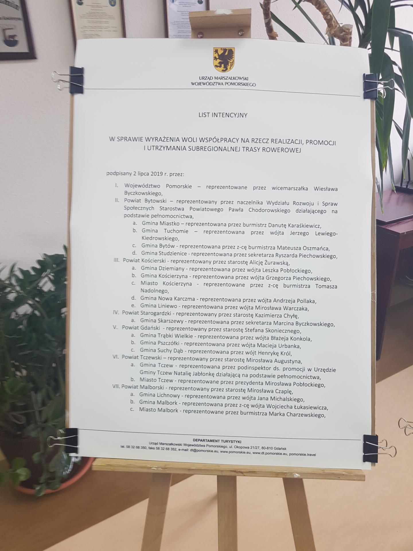 Podpisanie Listu intencyjnego w sprawie realizacji wspólnego dla Województwa Pomorskiego projektu, polegającego na budowie Subregionalnej Trasy Rowerowej