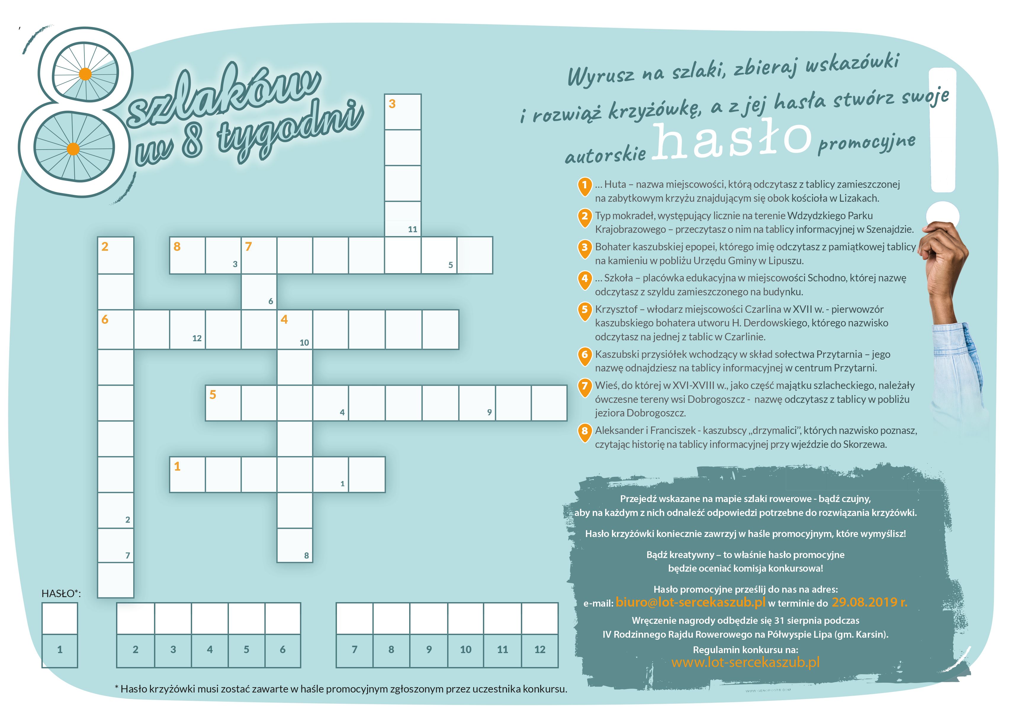 Konkurs polega na odnalezieniu w terenie, na ośmiu szlakach rowerowych, odpowiedzi do pytań krzyżówki wskazanych na karcie gry (do pobrania na stronie www.lot-sercekaszub.pl). Po rozwiązaniu krzyżówki, wskazane cyfry utworzą hasło, które uczestnik musi wykorzystać (zawrzeć) w wymyślonym przez siebie, autorskim haśle promocyjnym (maksymalnie 30 słów). Hasło promocyjne należy przesłać na adres email: biuro@lot-sercekaszub.pl w terminie do 29.08.2019 r., podając imię i nazwisko osoby zgłaszającej oraz numer telefonu. Zgłoszenie powinno być wykonane na osobę pełnoletnią. Hasło promocyjne wymyślone przez uczestnika stanowi główne kryterium przyznania nagrody w konkursie przez Komisję Konkursową.
