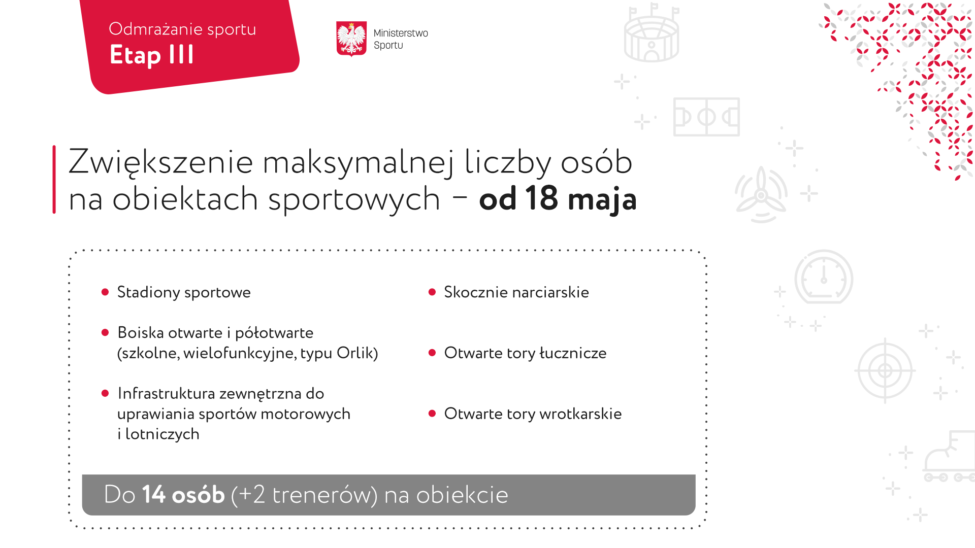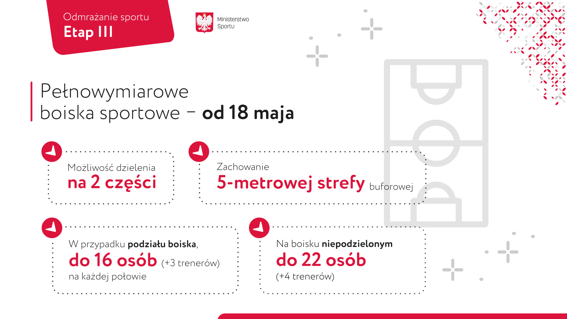 o obowiązujących zasadach bezpieczeństwa: zachowaniu dystansu społecznego, obowiązku zasłaniania twarzy (w momencie dotarcia na dany obiekt sportowy, natomiast przebywając na np. boisku nie ma obowiązku zakrywania twarzy), weryfikacji uczestników (zgłoszenie do zarządcy liczby osób wchodzących na obiekt), dezynfekcji urządzeń po każdym użyciu i każdej grupie, obowiązkowej dezynfekcji rąk dla wchodzących i opuszczających obiekt czy korzystaniu z osobistego sprzętu treningowego lub dezynfekcji po każdym użyciu. Zarazem nadal nie będzie możliwości korzystania z szatni i węzła sanitarnego (poza WC).