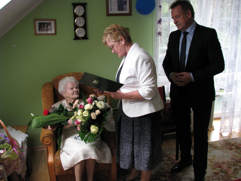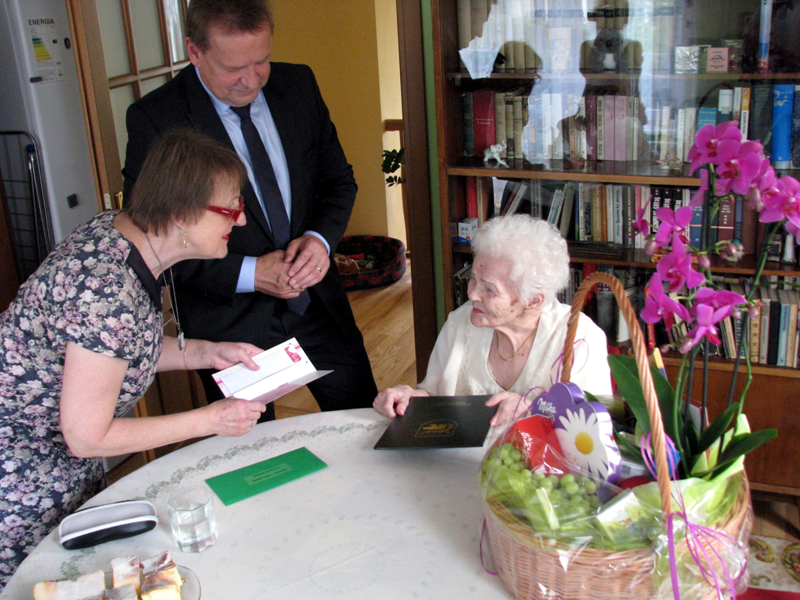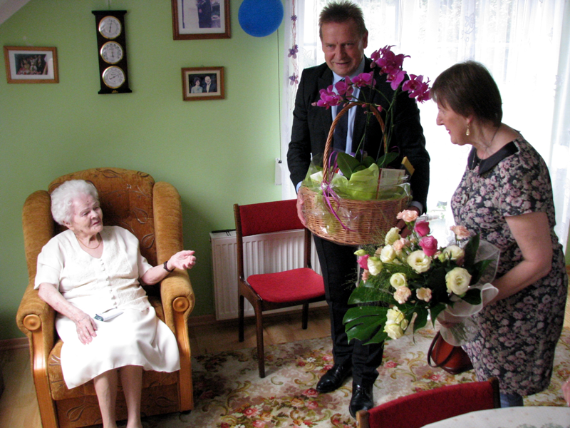 W dniu 05 sierpnia 2012 r. Pani Maria Skibińska, mieszkanka Kościerzyny obchodzi 100 rocznice urodzin. Z tej okazji Burmistrz Miasta Kościerzyna Zdzisław Czucha wraz z Panią Janiną Czają Dyrektorem Miejskiego Ośrodka Pomocy Społecznej oraz Panią Krystyną Karczyńską Kierownikiem Inspektoratu Zakładu Ubezpieczeń Społecznych w Kościerzynie złożyli wizytę dostojnej Jubilatce. Dostojni goście składając Pani Marii serdeczne życzenia wręczyli kwiaty i upominki. Pani Marii jeszcze raz składamy życzenia wszelkiej pomyślności. Niech kolejne lata będą dla Niej źródłem szczęścia i niech upływają w zdrowiu i spokoju.
