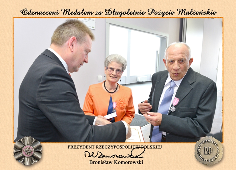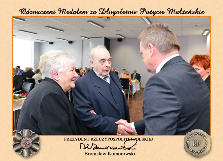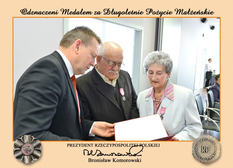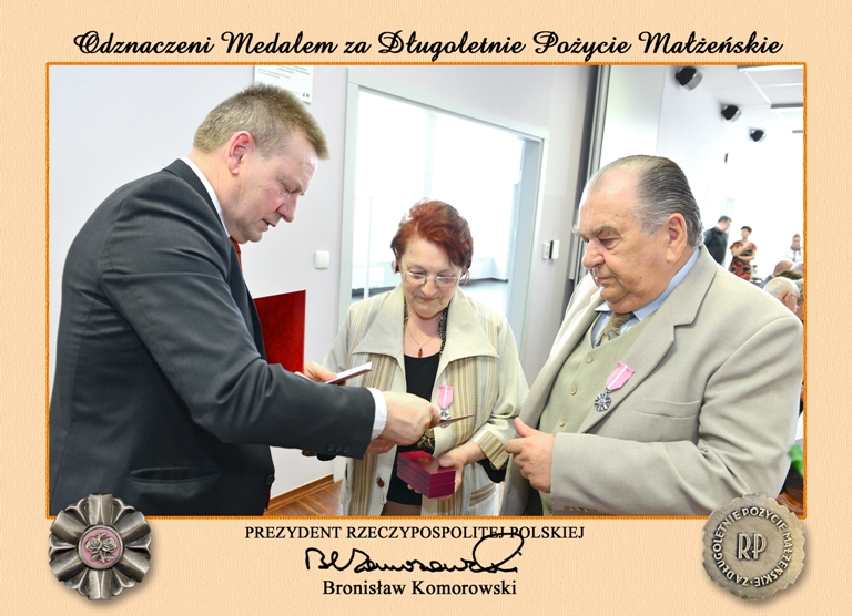 W dniu 18 kwietnia br. w Sali Widowiskowej im. Lubomira Szopińskiego w Kościerzynie odbyła się uroczystość jubileuszu 50-lecia pożycia małżeńskiego. W imieniu Prezydenta RP, burmistrz Kościerzyny Zdzisław Czucha wręczył z tej okazji „Medale za długoletnie pożycie małżeńskie”. W ceremonii wzięli również udział przełożony Domu Zakonnego w Parafii Zmartwychwstania Pańskiego w Kościerzynie ks. Józef Domaradzki oraz w imieniu ks. Prałata Mariana Szczepińskiego - ks. Marcin Wawrzynkowski.