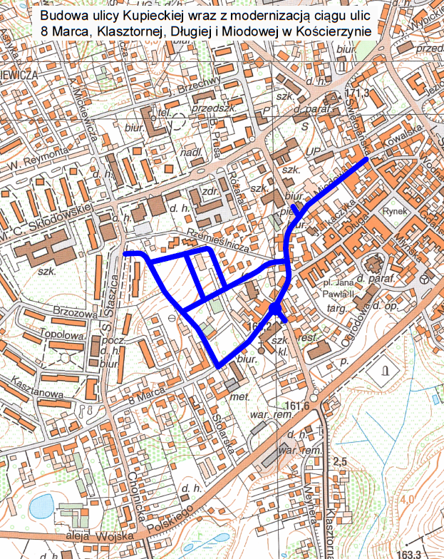 W dniu 6 maja br. została podpisana umowa na realizację zadania pn. „Budowa ulicy Kupieckiej wraz z modernizacją ciągu ulic 8 Marca, Klasztornej, Długiej i Miodowej w Kościerzynie”. Wykonawcą robót jest Przedsiębiorstwo Usług Drogowo - Mostowych S.A. z siedzibą w Kościerzynie. Planowany termin zakończenia zadania – październik 2013 r. W związku z prowadzonymi robotami wystąpią utrudnienia w ruchu drogowym, o których będziemy informować na bieżąco.