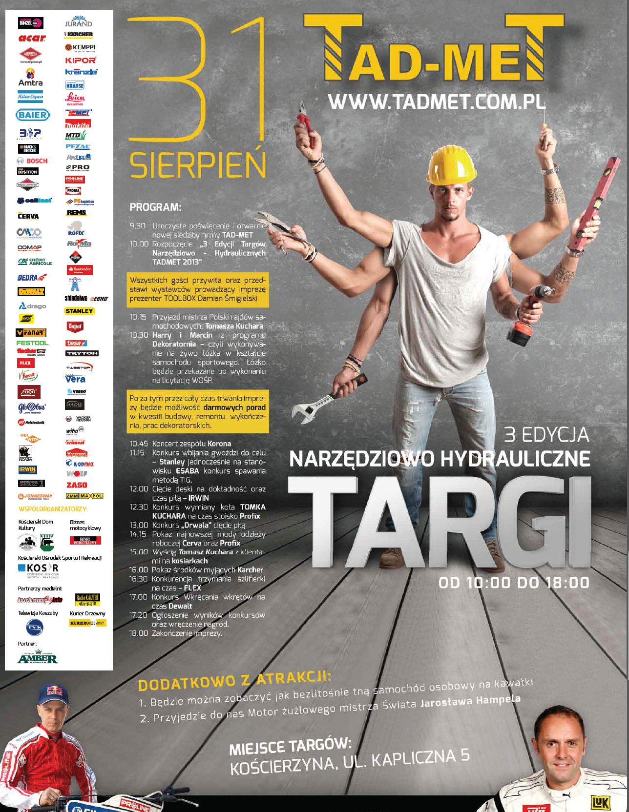 Zapraszamy na 3 edycje Targów Narzędziowo Hydraulicznych, które odbędą się w dniu 31 sierpnia w godz. od 10:00 do 18:00. W programie m. in.: koncert zespołu Korona, konkurs wbijania gwoździ do celu, cięcie deski na dokładność oraz czas piłą, konkurs wymiany koła na czas oraz wyścig Tomasza Kuchara z klientami na KOSIARKACH! Zapraszamy!